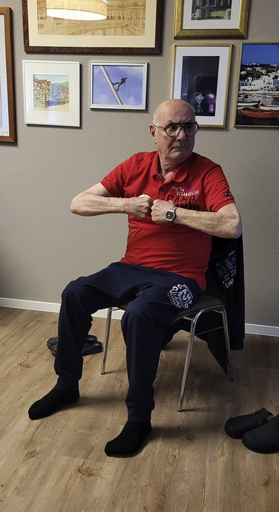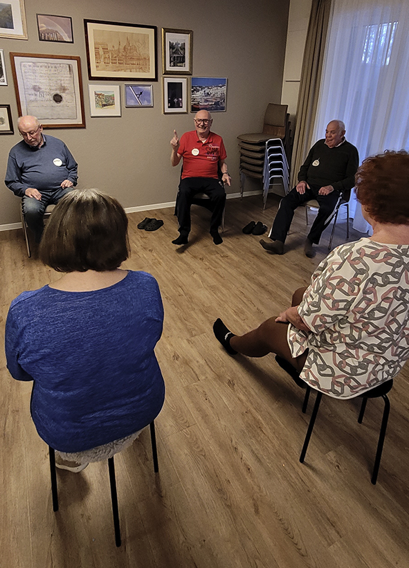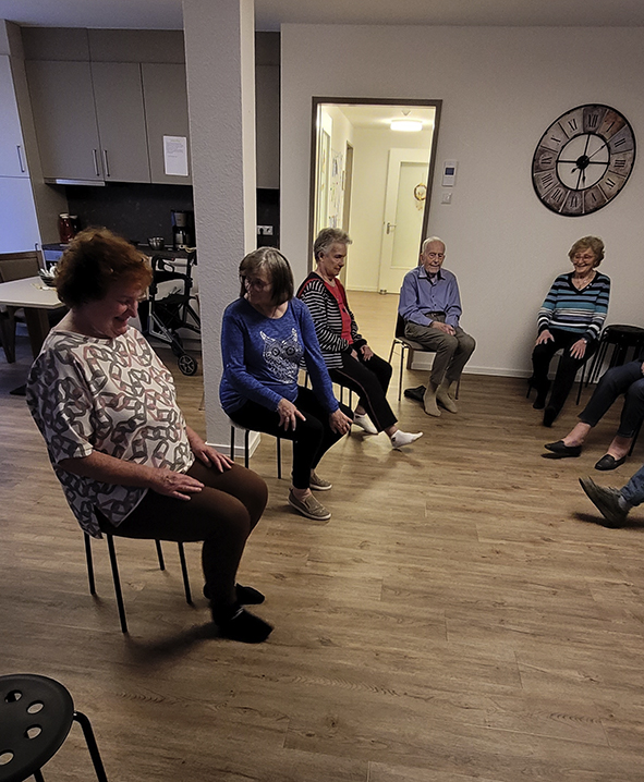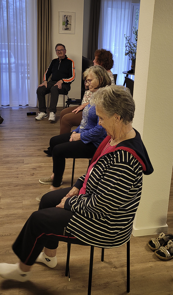 Jeden Dienstag um 17 Uhr geht es los. Im Gemeinschaftsraum werden die Tische beiseite gerückt und ein Kreis aus Sporthockern entsteht. Die Rehasportgruppe auf dem Zauberberg beginnt. Gut die Hälfte der Mieter trifft sich hier jede Woche. Hier wird die vorhandene Leistungsfähigkeit entdeckt und die eigenen Grenzen erkannt. Die Muskulatur wird langsam und beständig aufgebaut, die Kondition und die Belastbarkeit verbessert, was zu deutlichen Erleichterungen im Alltag und zu mehr Lebensqualität führt. Und in der Gruppe macht es auch noch Spaß….